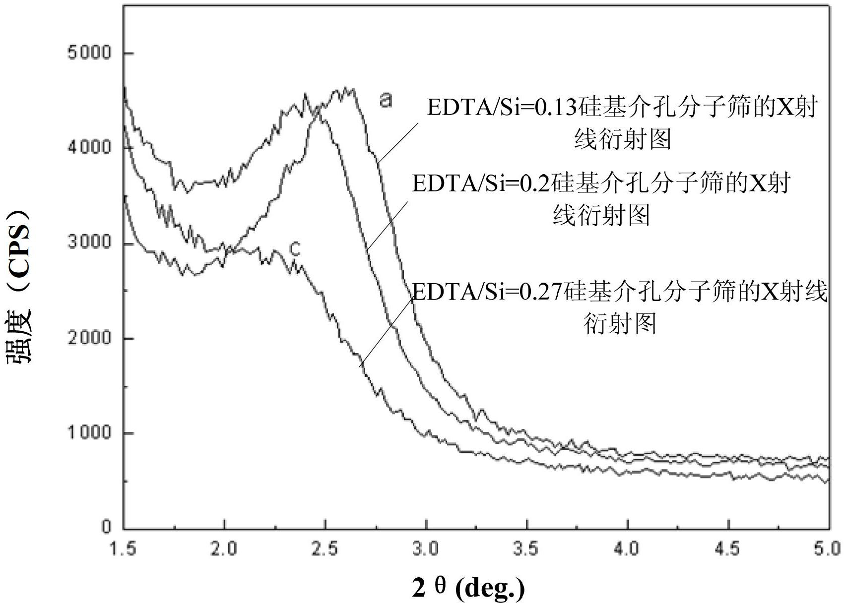 摘要 本發(fā)明涉及化學(xué)領(lǐng)域,具體為一種硅基介孔分子篩及其制備方法,該硅基介孔分子篩原料及添加比為:以物質(zhì)的量計,以硅源為單位1mol計算,0-120mol無水乙醇、70-400mol去離子水、0.1-0.35mol季銨鹽型陽離子表面活性劑、0.05-0.40mol乙二胺四乙酸二鈉、2-7mol氨水、所述硅源為正硅酸乙酯。本發(fā)明能夠得到高度有序,粒徑較小的硅基介孔分子篩。